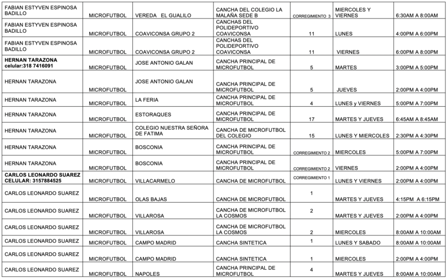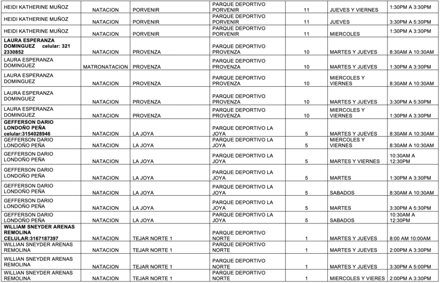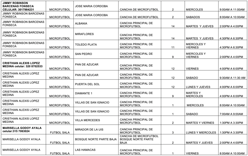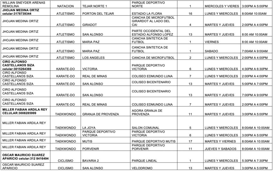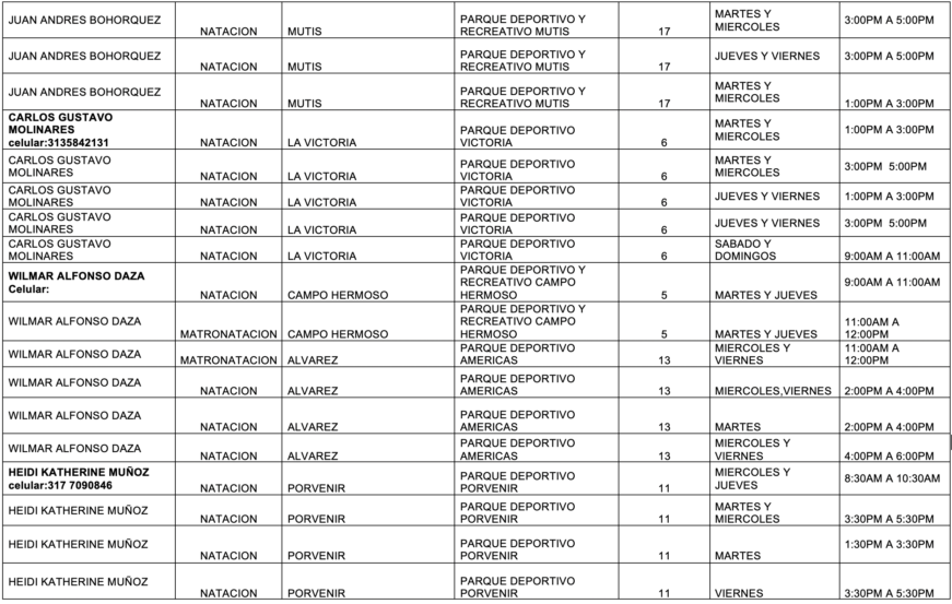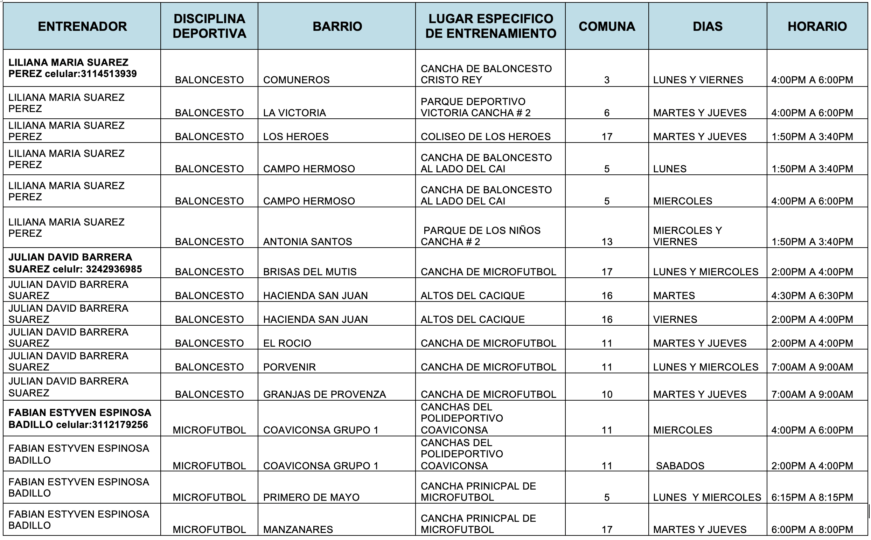 Horarios y Deportes Escuelas de Formación Deportivas del INDERBU