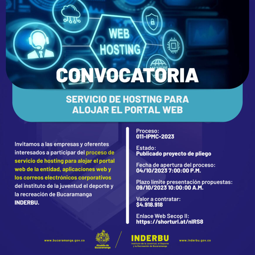 Se encuentra publicado en página web del SECOP II www.contratos.gov.co, la invitación pública de mínima cuantía 011-IPMC-2023, con el objeto de servicio de Hosting para alojar el portal web de la entidad, aplicaciones web y correos electrónicos corporativos del Instituto de la Juventud, el Deporte y la Recreación de Bucaramanga- INDERBU”.